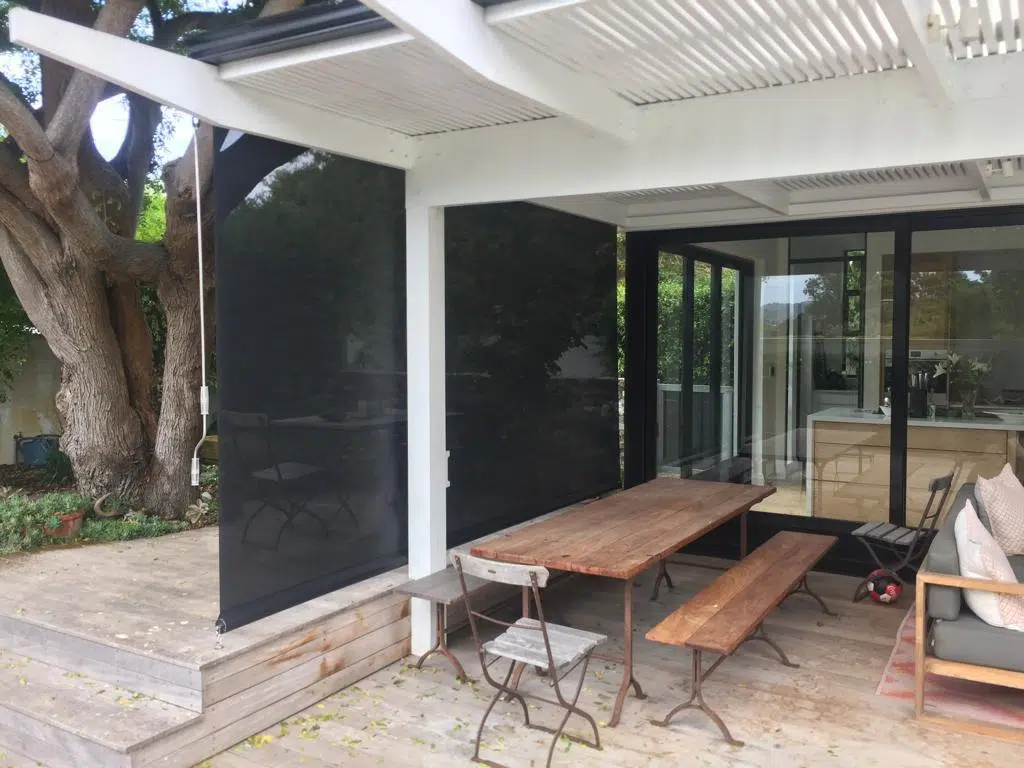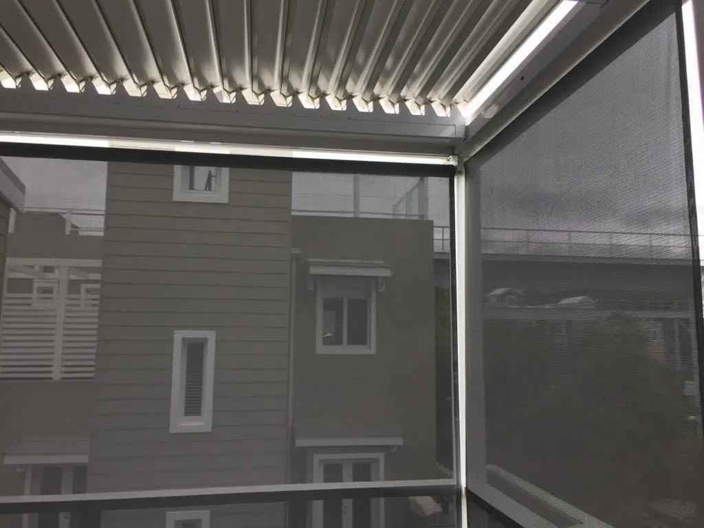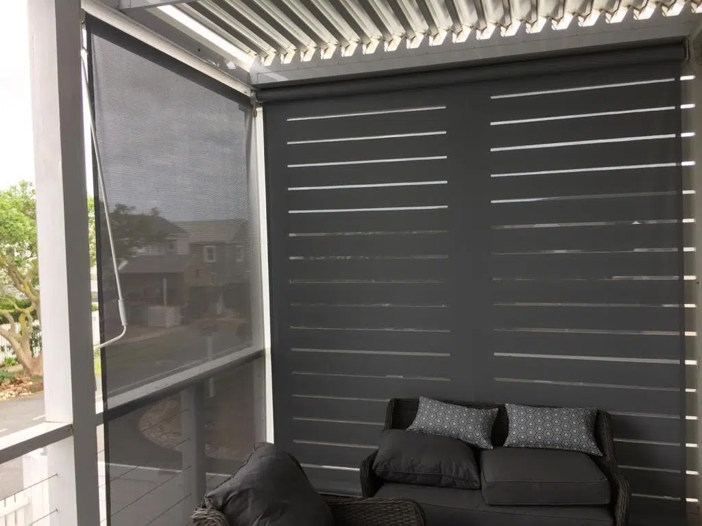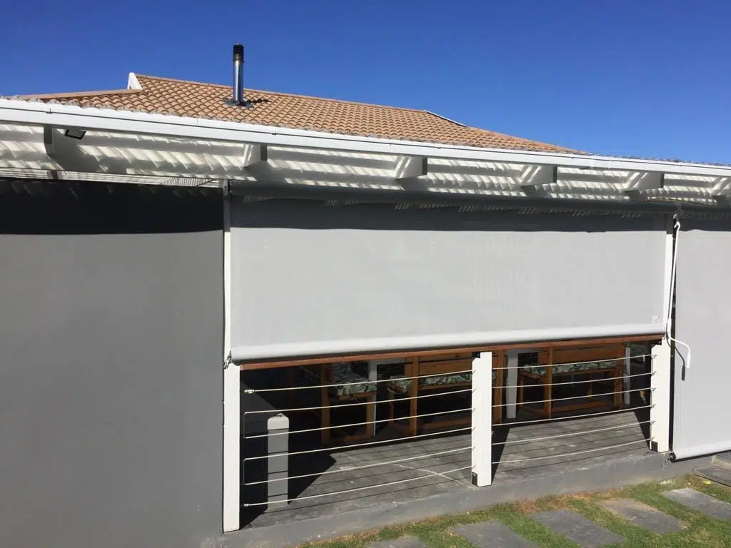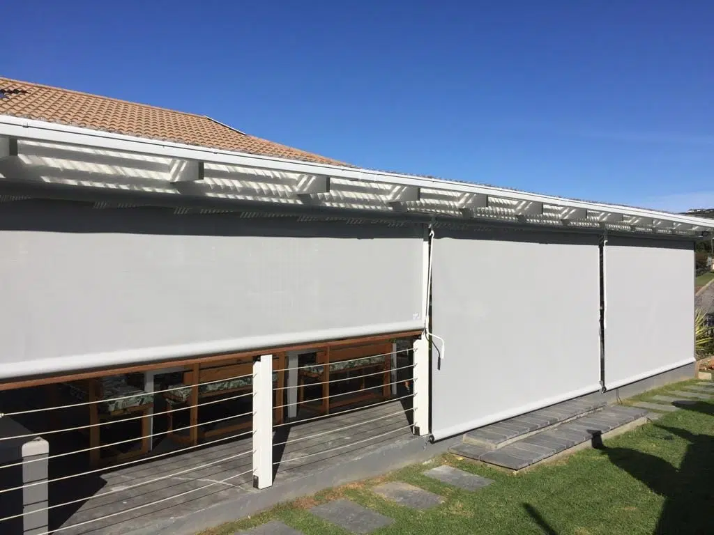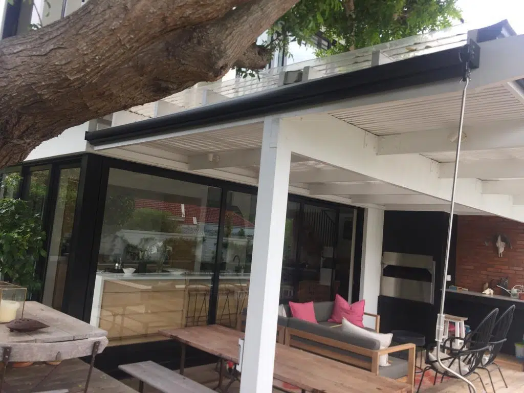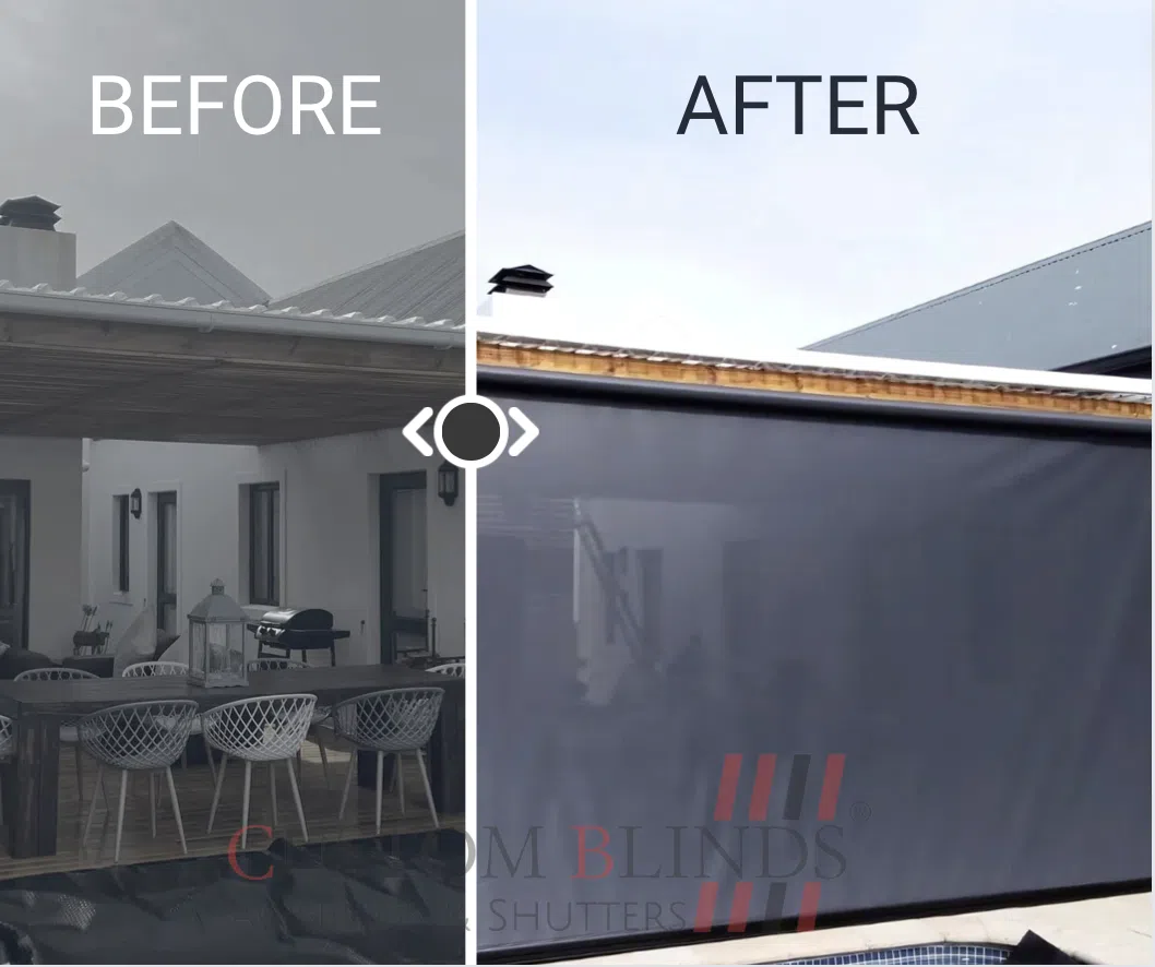 The Custom Blinds® Portfolio of Installations. This is a louverd awning with a customised colour application to better blend in with the Simola home and surroundings. Sunworker Outdoor Drop Down Blinds Portfolio. Outdoor Weather Blinds Portfolio Retractable Awnings Portfolio