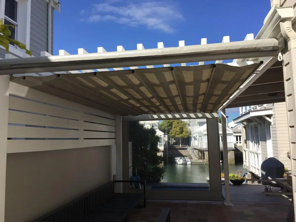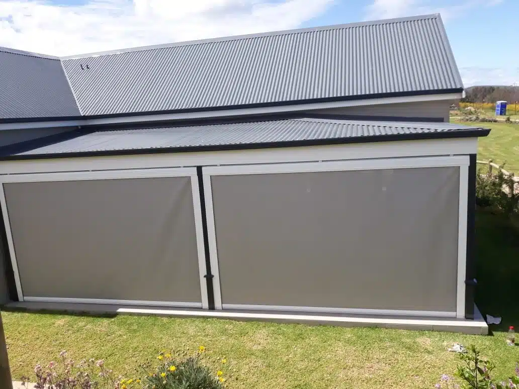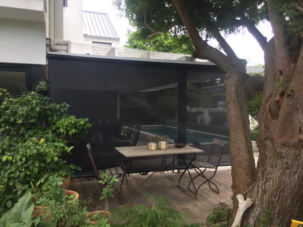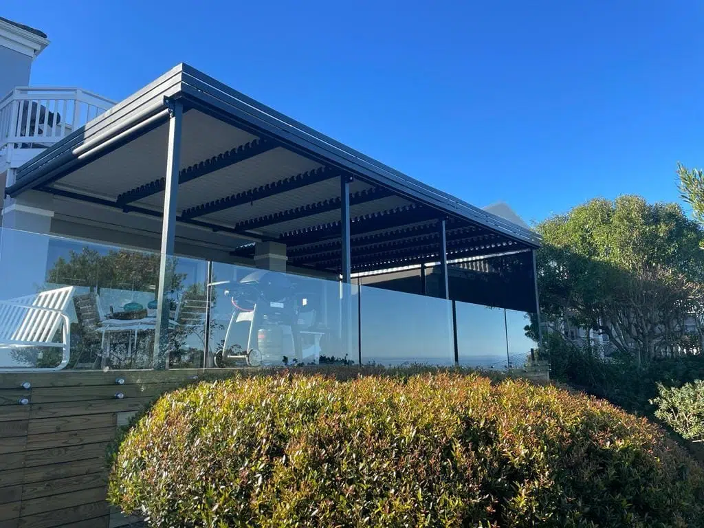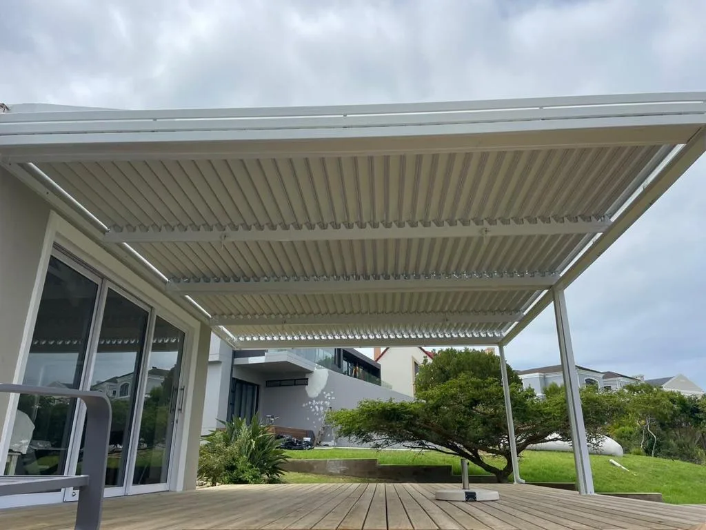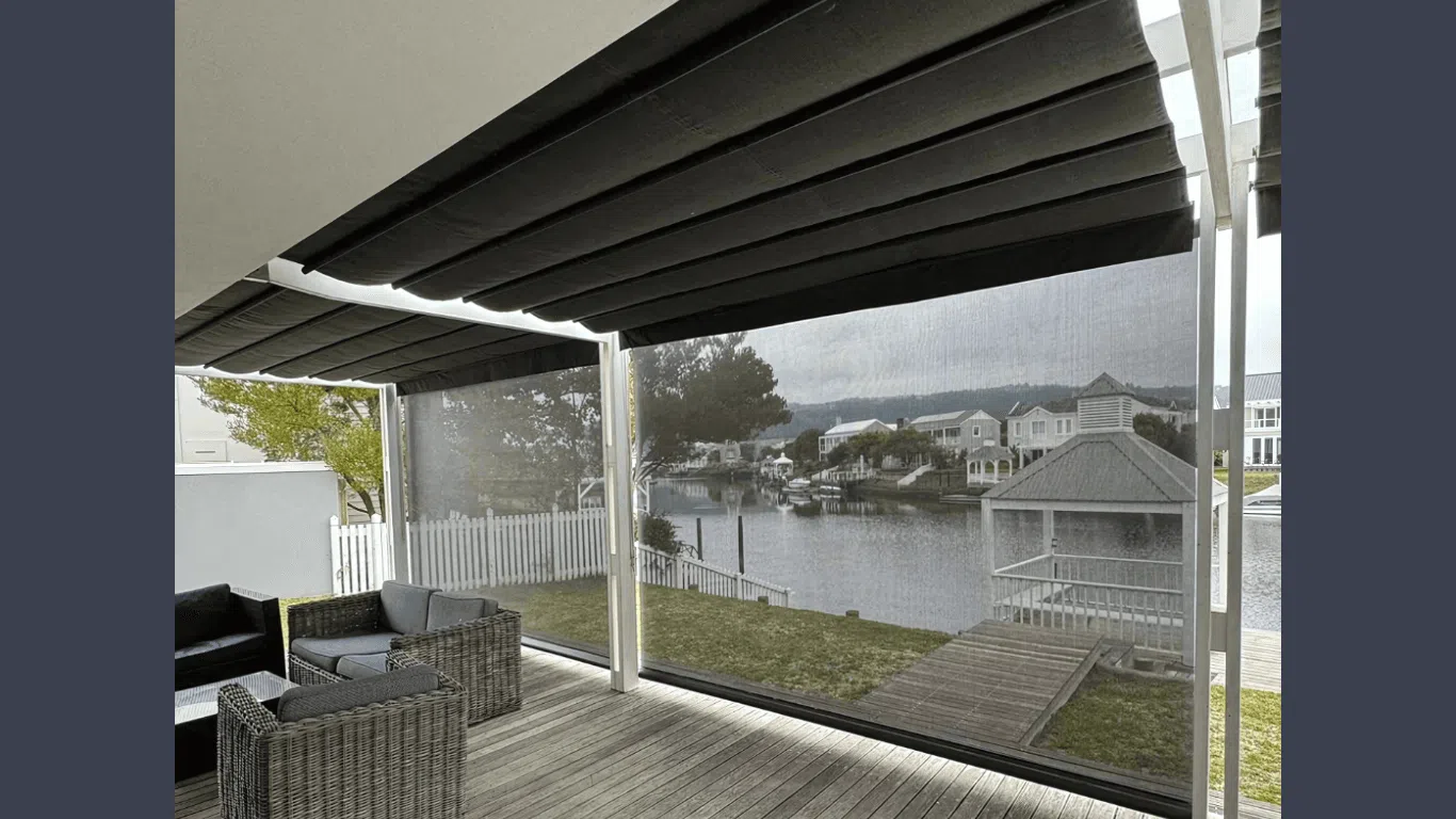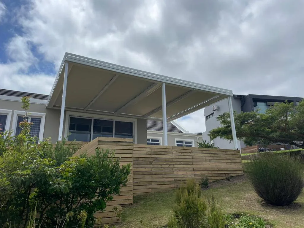 The Custom Blinds® Portfolio of Installations. This is a louverd awning with a customised colour application to better blend in with the Simola home and surroundings. Sunworker Outdoor Drop Down Blinds Portfolio. Outdoor Weather Blinds Portfolio Retractable Awnings Portfolio