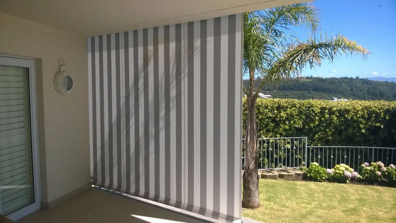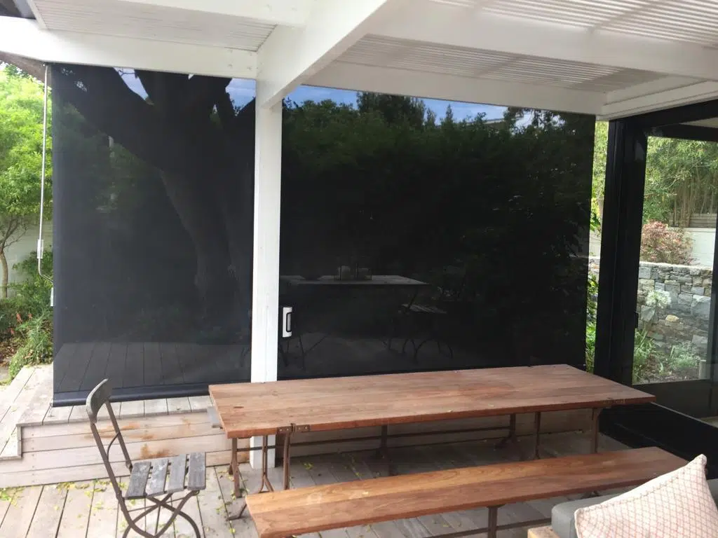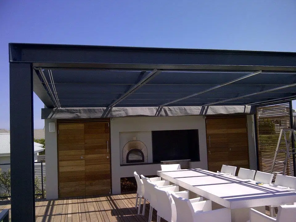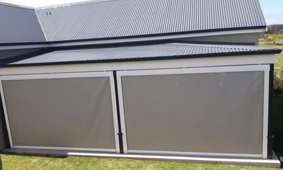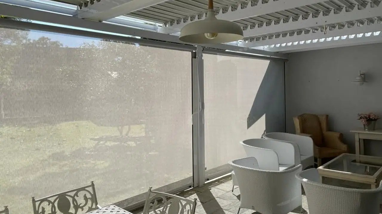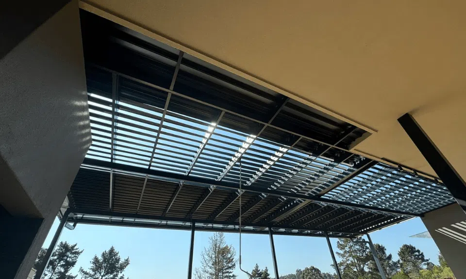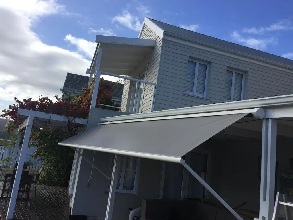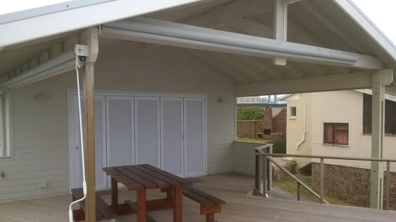 The Custom Blinds® Portfolio of Installations. This is a louverd awning with a customised colour application to better blend in with the Simola home and surroundings. Sunworker Outdoor Drop Down Blinds Portfolio. Outdoor Weather Blinds Portfolio Retractable Awnings Portfolio