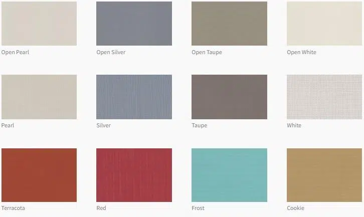 Acrylic fabrics provide rich colour and a soft woven look, ideal for patios and decks. Technical screen fabrics allow partial visibility and are excellent for glare control and coastal durability. Both are UV resistant and easy to clean with mild soap and water.